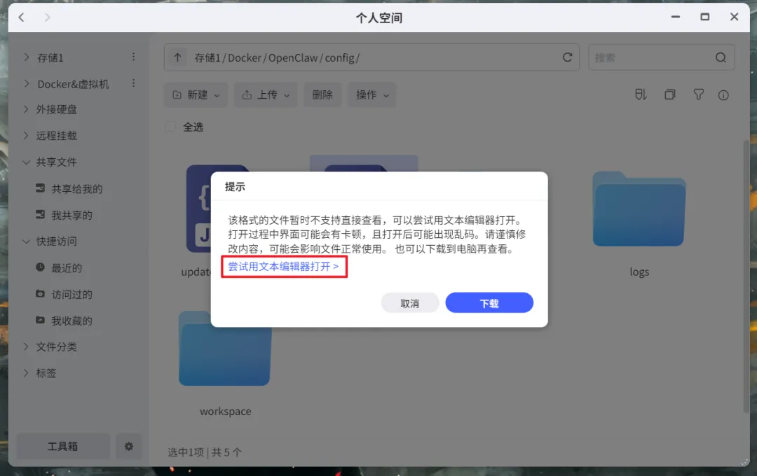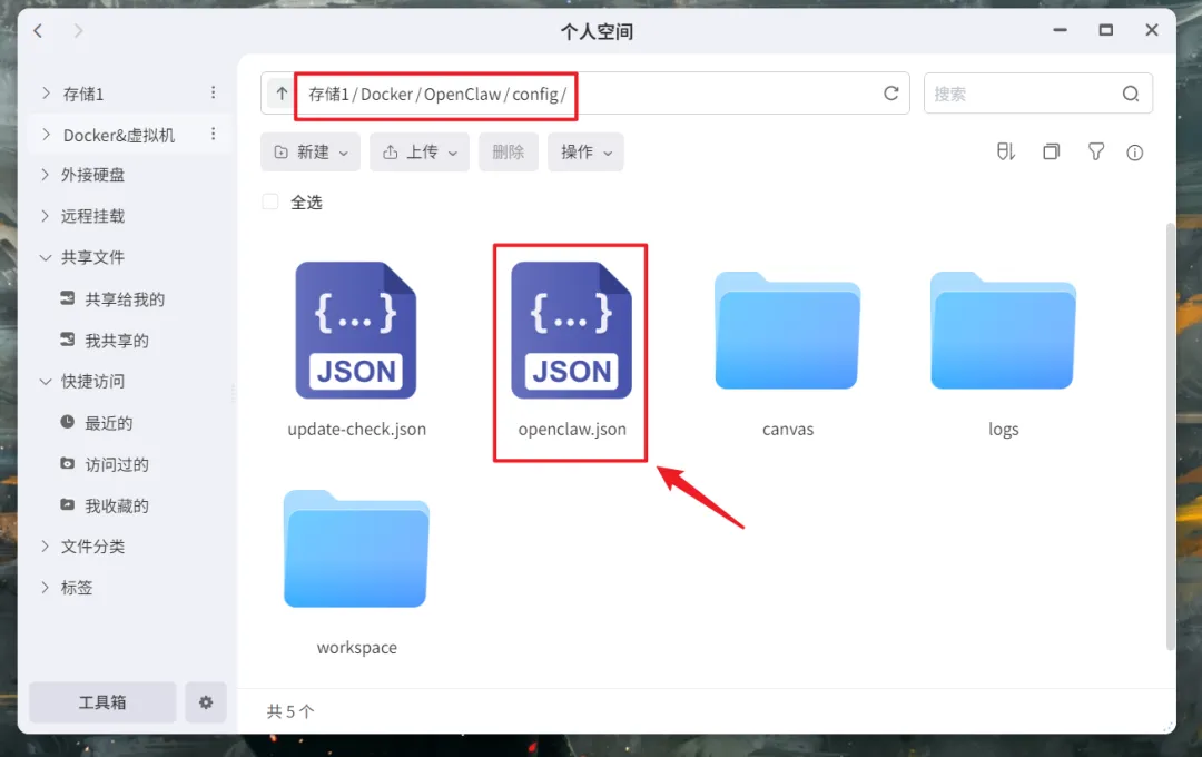 🔺而这个时候需要需要先找到极空间中的“OpenClaw/config/openclaw.json”文件并打开。