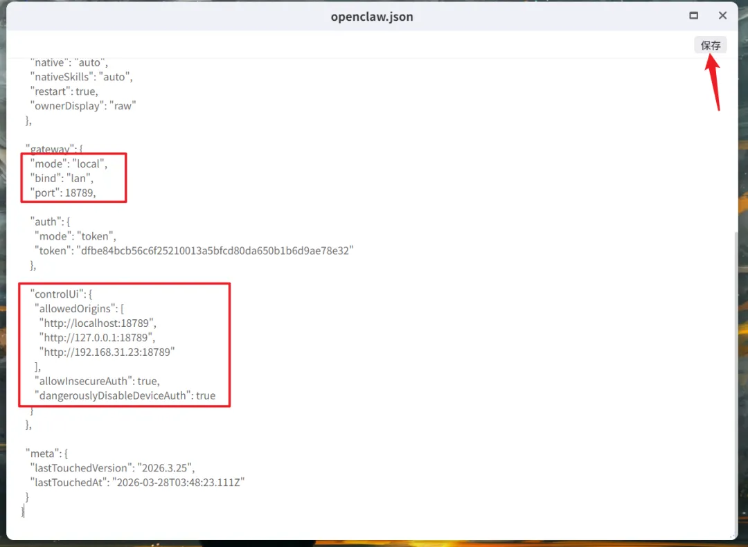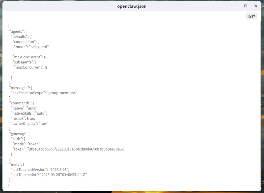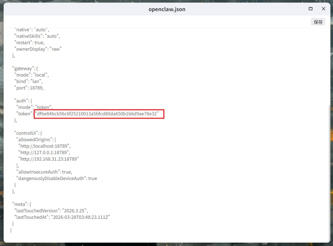 🔺而它的token其实就是网关令牌,同样在“OpenClaw/config/openclaw.json”文件中的“gateway”下面,将它复制下来。