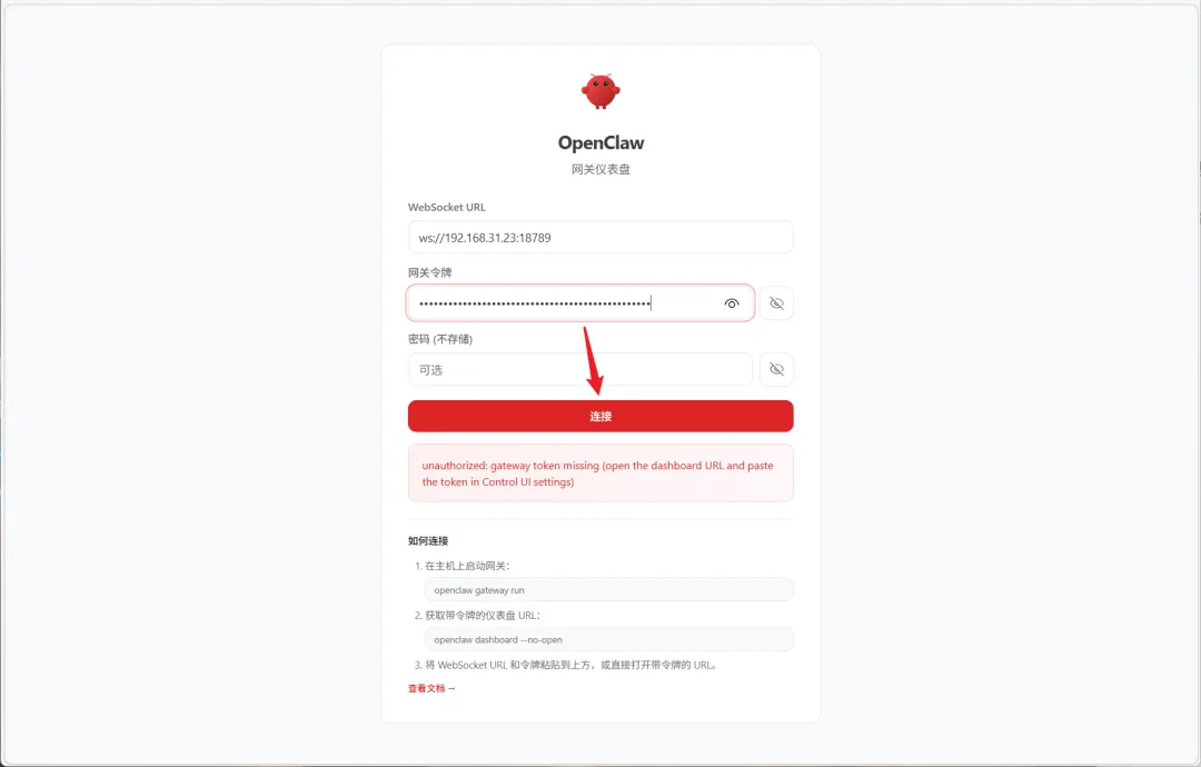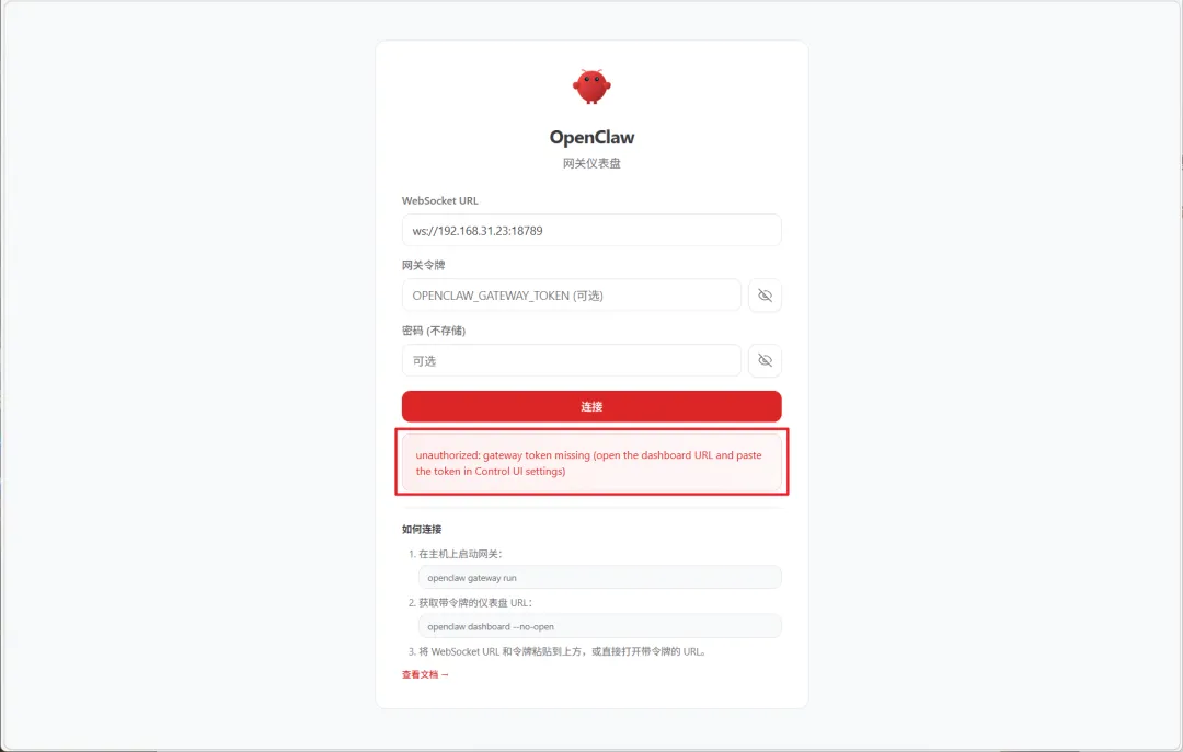🔺等到它再次正常运行之后,这个时候通过浏览器【IP:18789】打开就会有反应了,不过没什么意外,它这里又出意外了,会提示让我们输入token。