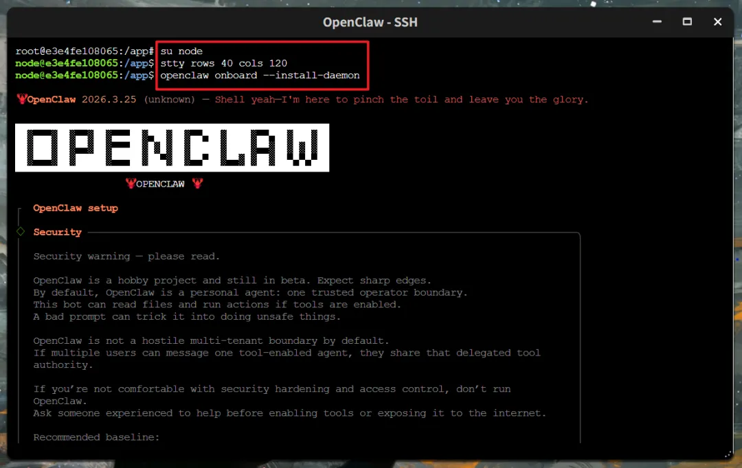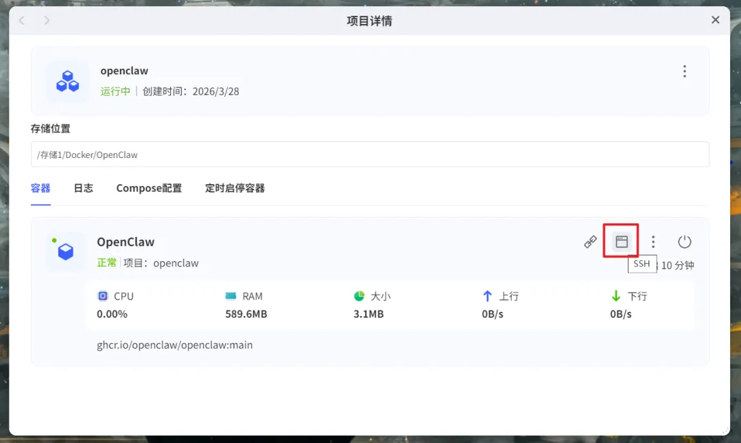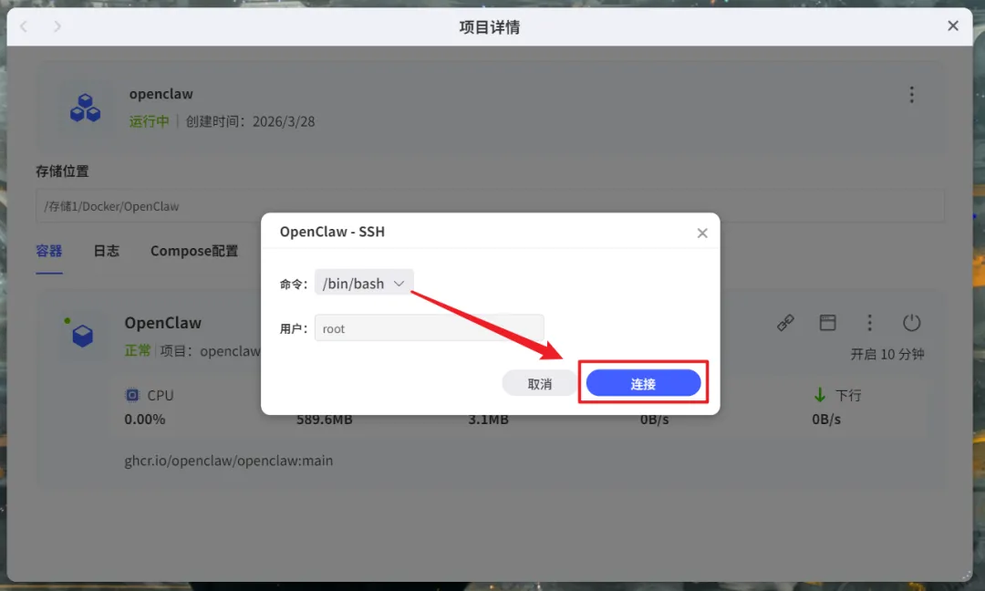 🔺接下来就要开始正式对OpenClaw初始化设置。在Docker管理器中打开OpenClaw的终端(SSH)。