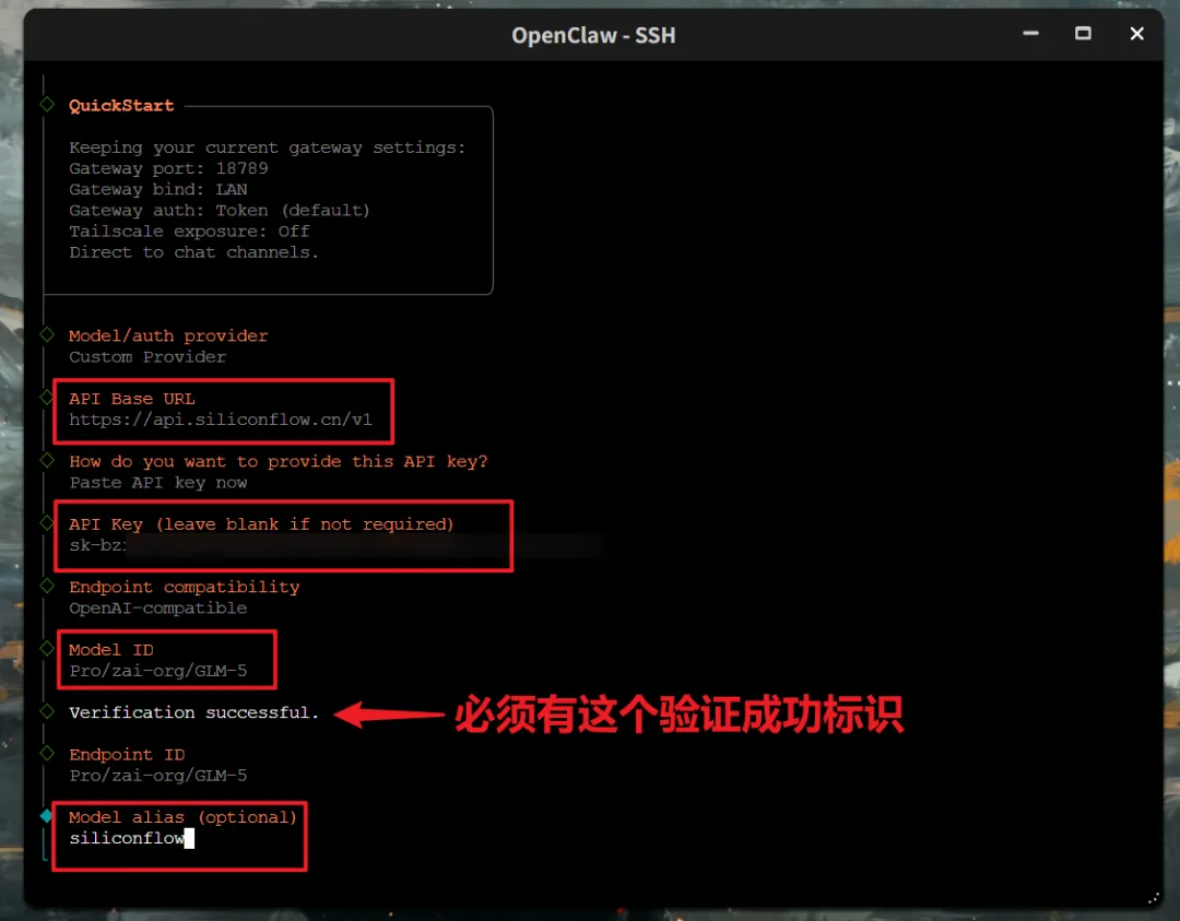 API Base URL:https://api.siliconflow.cn/v1 API Key:你自己真实的 API Key Model ID:大模型 id,直接在硅基流动那边随便复制一个就可以了,后期可以让龙虾自己更换 Model alias:模型别名,其实就是便于你自己区分的,随便填就可以。