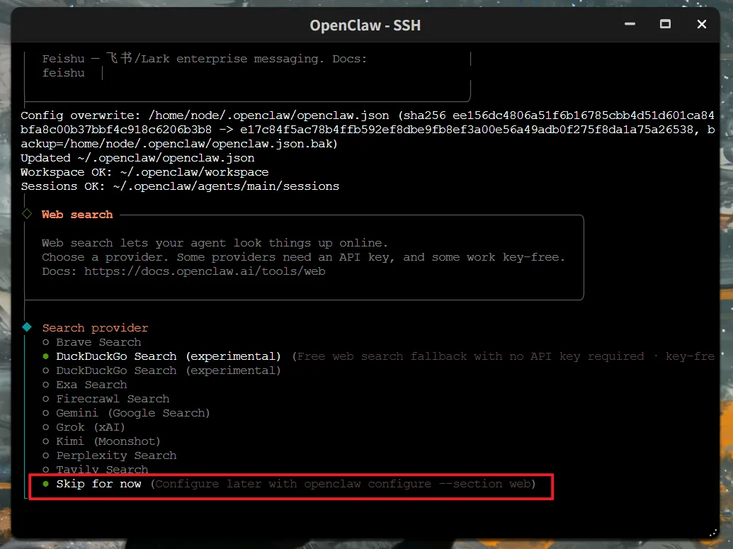 🔺这里是配置搜索服务商,先Skip for now(暂时跳过),后期我们单独设置适合国内使用的,比如说Tavily,或者是自建搜索服务引擎SearXNG。