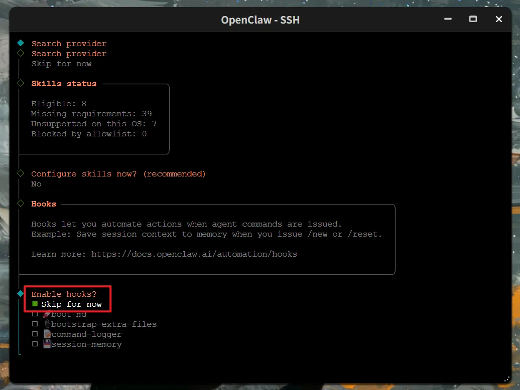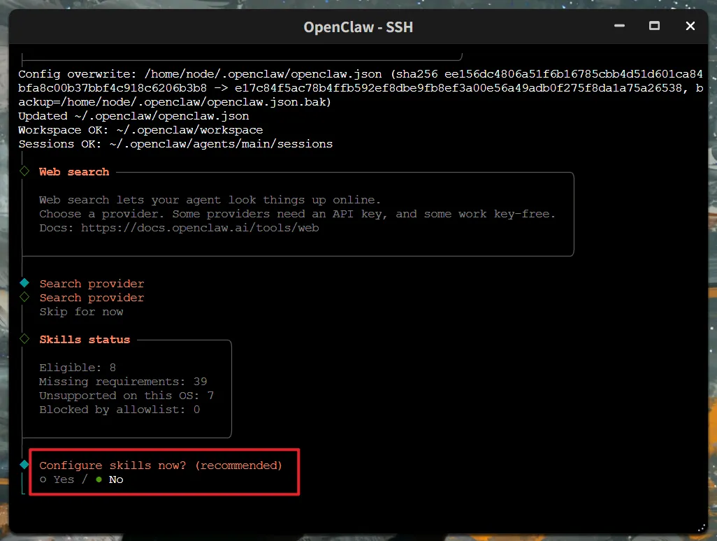 🔺然后是skills(技能)的安装,这里选择“No”,技能完全可以让龙虾自己装,不需要我们动手~
