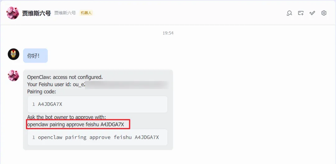 🔺飞书端的机器人上线之后会有一个验证代码给我们,我们将这串代码复制一下。