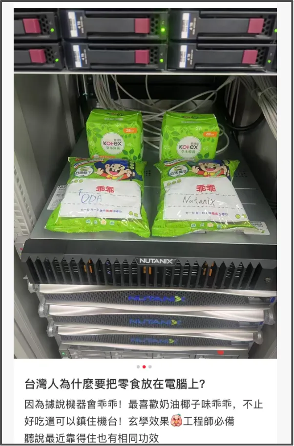 在台湾IT界,则历来有用一款品牌名叫“乖乖”的膨化食品放置在主机上的习惯,祈求机器能够乖乖运行,不要出岔子。