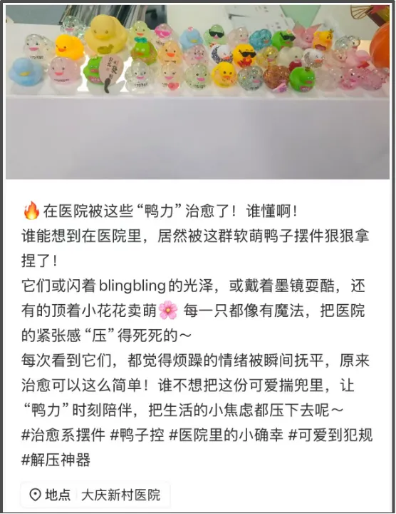 在以黑白灰等各种冷色调为主的医院里,这群五彩斑斓的鸭子显得尤为扎眼,其中还不乏隐藏款、限定款,有的鸭子甚至还被精心打扮,穿上了专属高定。