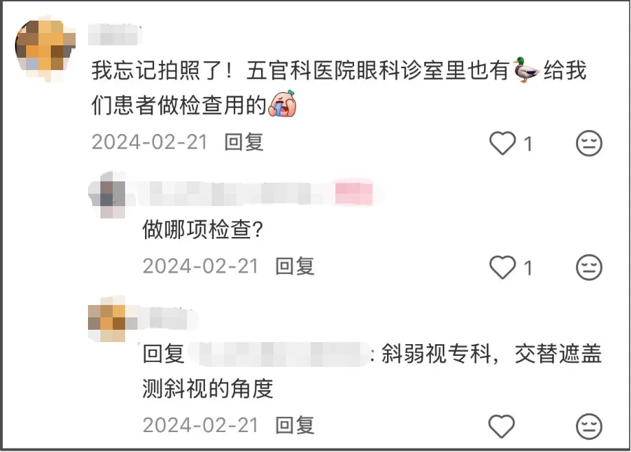 在五官科,小黄鸭担当斜弱视检查的工具,为患者提供参照。