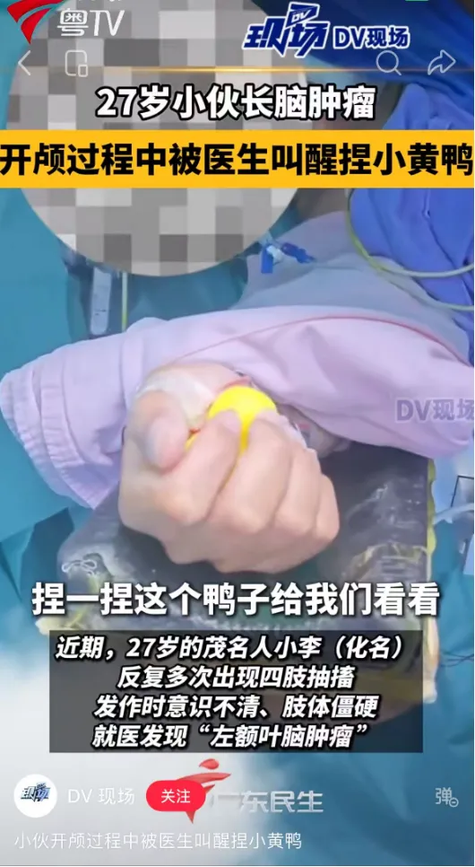 而在一起开颅手术中,医生则直接拿出小黄鸭,通过病人能否听清指令、捏响小黄鸭来测试病人意识是否清醒,四肢能否活动等。
