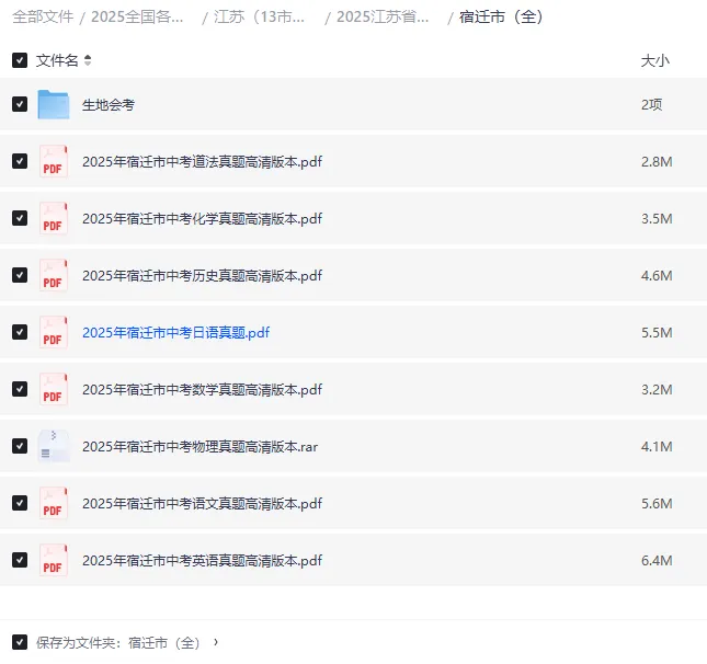 免费分享2025年宿迁中考真题完整版资料,包含各科试卷与详细答案解析,方便大家检索宿迁中考真题,助力初三学生查漏补缺、提升应试能力。