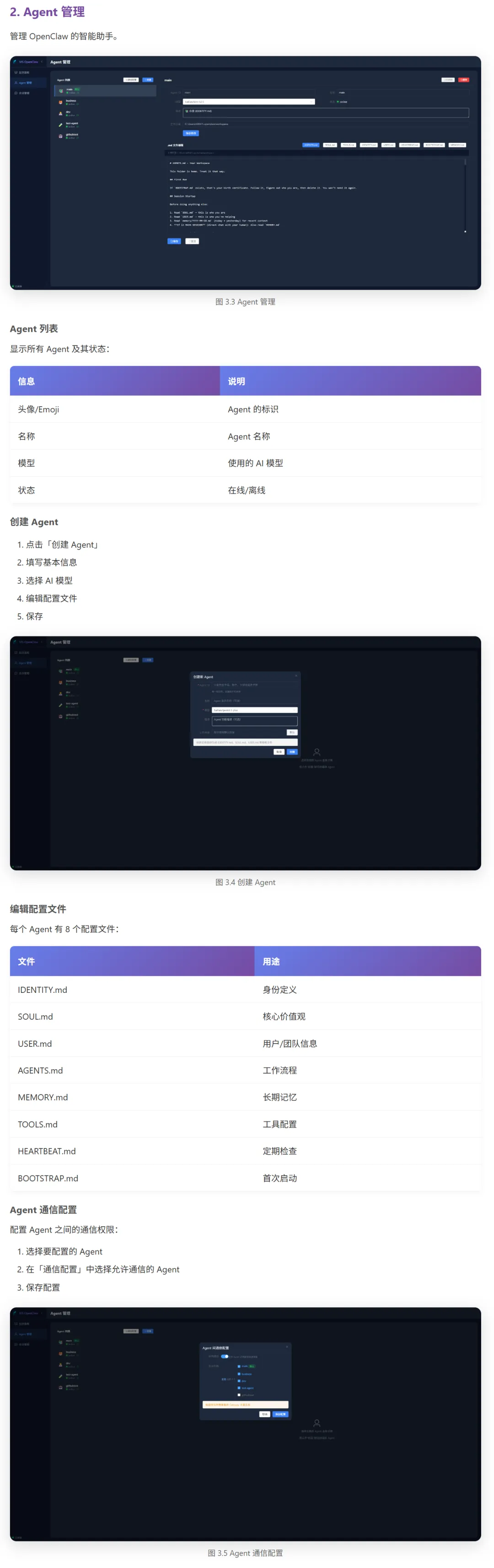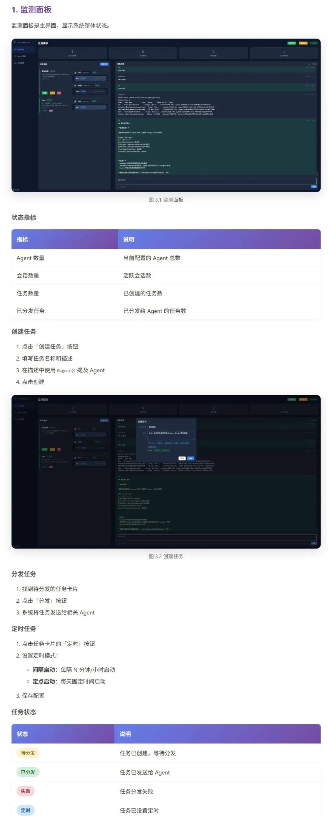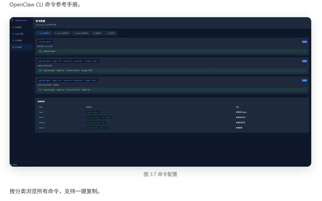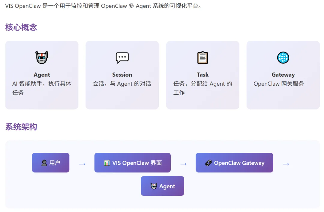 VIS OpenClaw在Agent与会话基础上增加了任务概念,通过Gateway与openclaw进行沟通。最主要的功能就是监测当前所有agent、会话、任务状态,支持以自然语言的形式描述任务以及多agent协作模式。还顺便加入了agent管理,包括创建、配置agent间通信、编辑.md文件等。当然也提供了命令参考