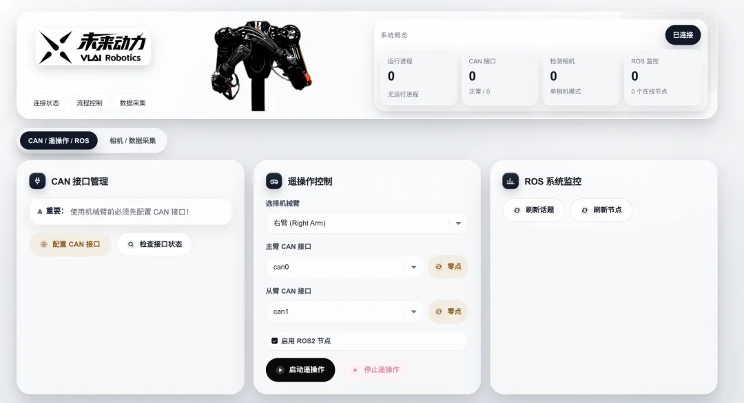 3. 全新机器人操控平台:一键控制、一键连接、一键监控、一键遥操作、一键数据采集