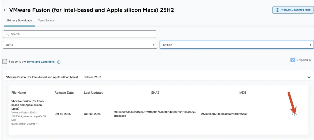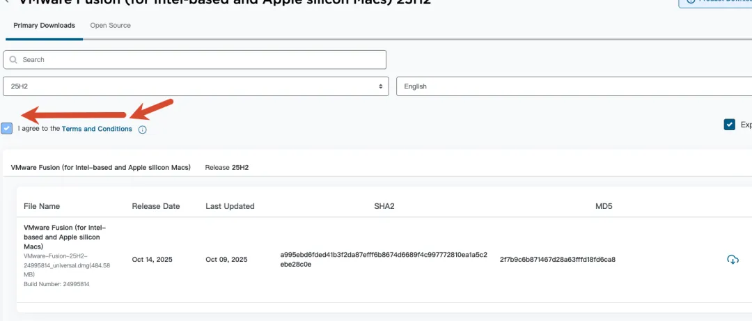 https://support.broadcom.com/group/ecx/productfiles?subFamily=VMware%20Fusion&displayGroup=VMware%20Fusion%2025H2&release=25H2&os=&servicePk=&language=EN&freeDownloads=true