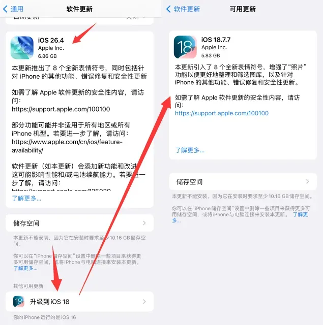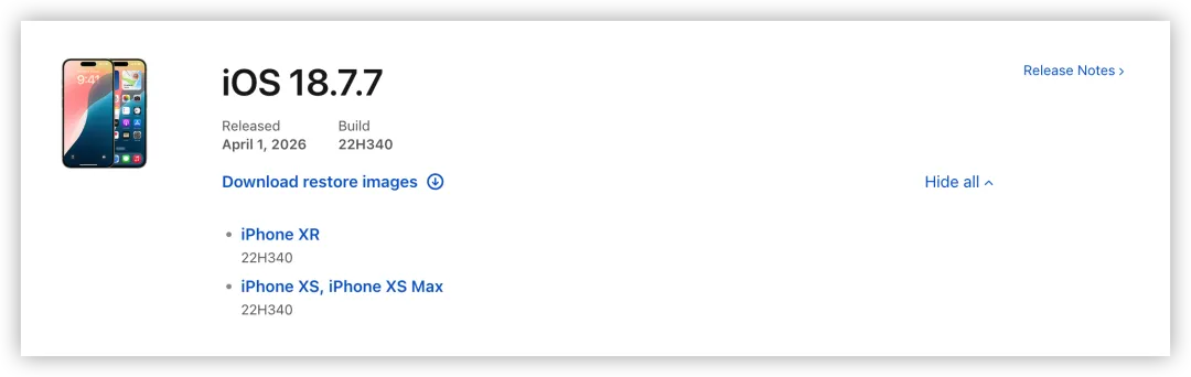 iOS 18.7.7 紧急发布,建议升级3 月 25 日,苹果发布了 iOS 26.4 正式版系统。彼时,iOS 18.7.7 仅面向部分旧款 iPhone 机型推送。而现在,苹果终于解除了这一限制,为更多 iPhone 推送了这一版系统。早些时候,苹果发言人向外媒 Wired 确认,将为更多设备提供 iOS 18 更新。按照苹果的说法,新系统中带来了重要的「安全保护」,修复了几个严重漏洞。分别是 DarkSword(主要针对 iOS 18)以及 Coruna(主要影响 iOS 13 至 iOS 17)。在此前的文章中,小果曾为大家介绍过这两个「网红」漏洞。本质上,DarkSword 和 Coruna 都是高度复杂的「全链条」攻击武器。通过对多个系统漏洞的整合利用,实施从浏览器到系统底层代码的突破。可在用户访问网页时,获取 iPhone 的最高权限。根据社交平台的反馈来看,iOS 18.7.7 的升级通道已全面开启。这意味着目前停留在 iOS 18 的 iPhone 用户,均可以收到 iOS 18.7.7 的更新推送。出于对安装率的追求,在 iOS 26 发布的一段时间后,官方就关闭了部分 iPhone 的 iOS 18 升级通道。尤其是,对于 iPhone 15/16 系列这些相对更新的设备来说。只能选择直接升级至 iOS 26,而无法接收到 iOS 18 的后续维护更新。对于已升级 iOS 26 的用户,仍无法通过验证通道降级回 iOS 18。同时苹果也强调称,iOS 26.4 正式版系统中也提供了类似的安全性更新。如果你的 iPhone 仍停留在旧版系统,请立即升级至更新的系统,以获取更加安全的使用环境。
