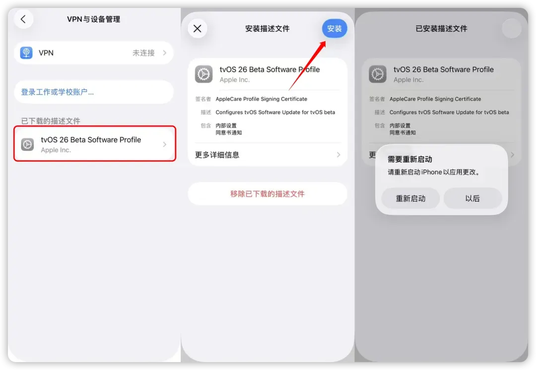 选择「tvOS 26 Beta」文件,点击右上角的「安装」。
