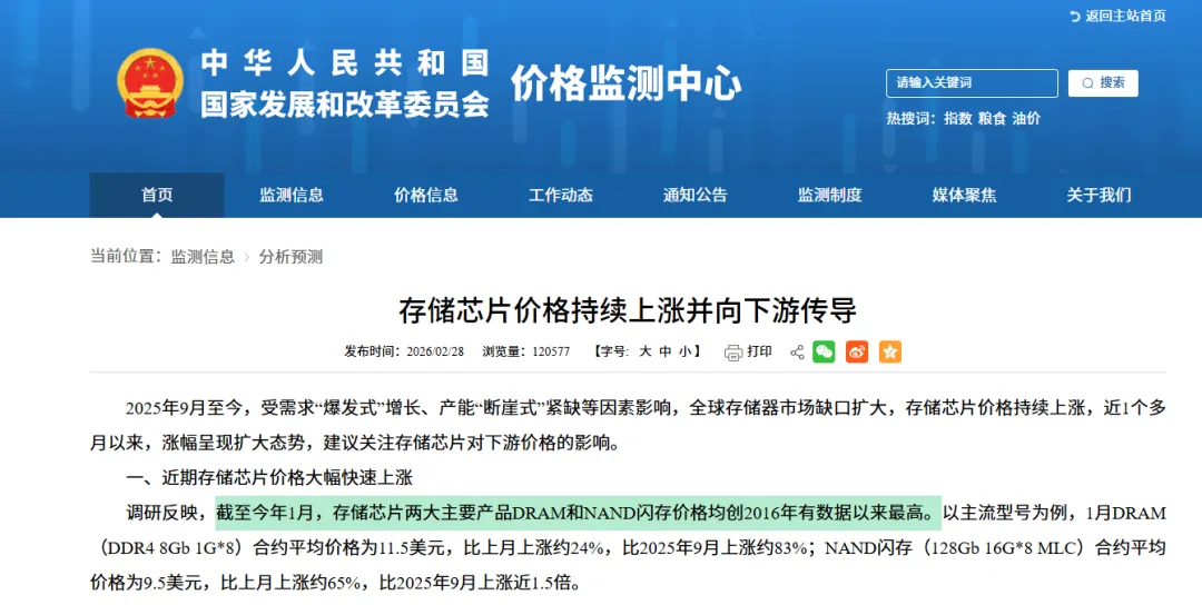根据TrendForce集邦咨询的统计数据,2025年第四季度,NAND Flash的合约价格实现了显著增长,环比涨幅介于33%至38%之间,而DRAM价格的上涨幅度则在45%至50%之间。进入2026年后,这一涨势不仅持续,且有加速的迹象。群智咨询的数据进一步显示,在第一季度,消费电子存储价格环比上涨超过60%,其中NAND价格的涨幅更是突破了70%。国家发展改革委价格监测中心的数据也表明,截至2026年1月,全球DRAM和NAND价格均创下自2016年有统计数据以来的最高值。
