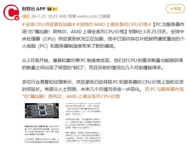 供应链信息显示,英特尔和AMD已正式通知客户将于2026年3月和4月分别上调全系列CPU价格,平均涨幅达10%-15%,部分服务器高端型号涨幅更高。