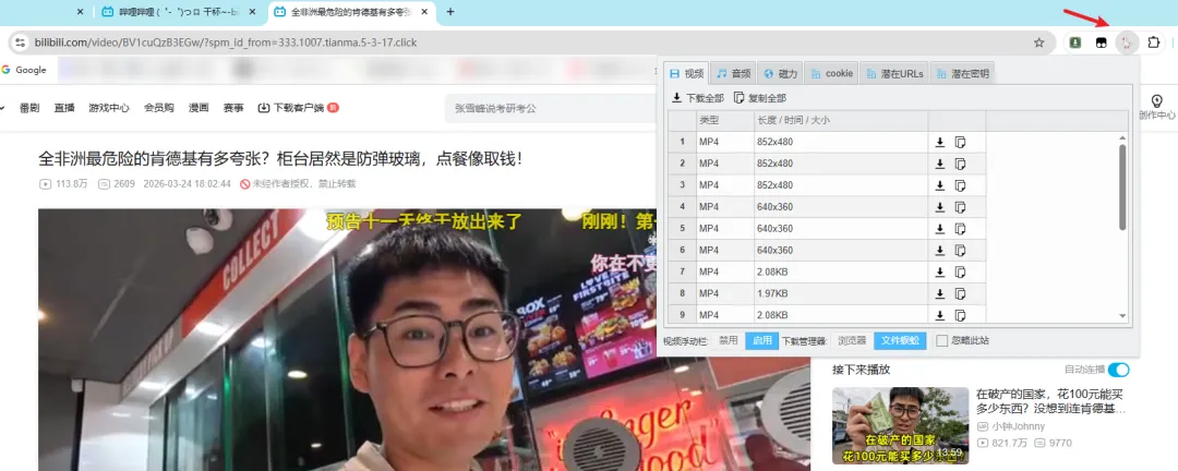 这个软件最让我惊喜的,其实是它的网页嗅探功能。大家平时在网页上看视频或者是听音乐,有时候想保存下来,但是网页不提供下载按钮,这时候只要点击浏览器右上角的文件蜈蚣插件,它就能自动把网页里的媒体资源给抓出来,一般体积最大的那个就是你要找的视频,点一下就能下载,特别的实用。