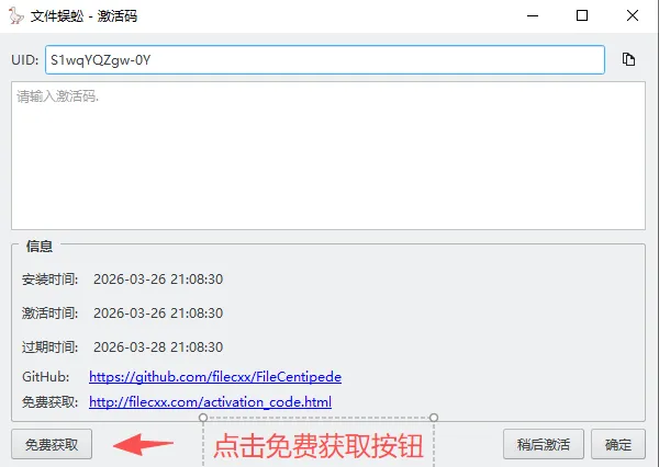 在弹出的激活码窗口,点击左下角免费获取按钮,