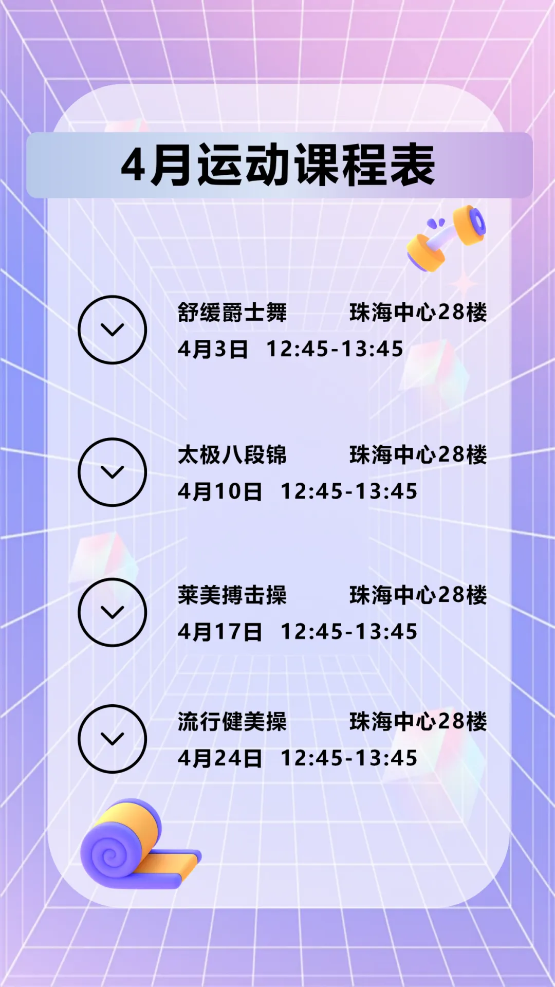 4 月全新启幕本年度持续开练,精彩不间断。每周五 12:45-13:45 在珠海中心大厦28楼准时赴约,用运动突破自我,焕新职场状态。【回归特别活动】八段锦・唤醒力量专为职场人定制春天的第一份自律从八段锦开始,唤醒身体的阳气由舒缓爵士舞到活力健美操、燃脂搏击操循序渐进,由静到动帮你平衡工作与身体焕新一整天职场状态