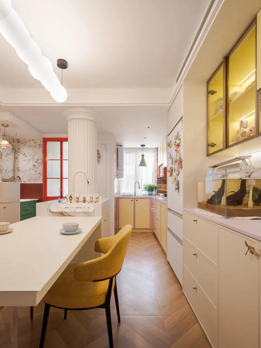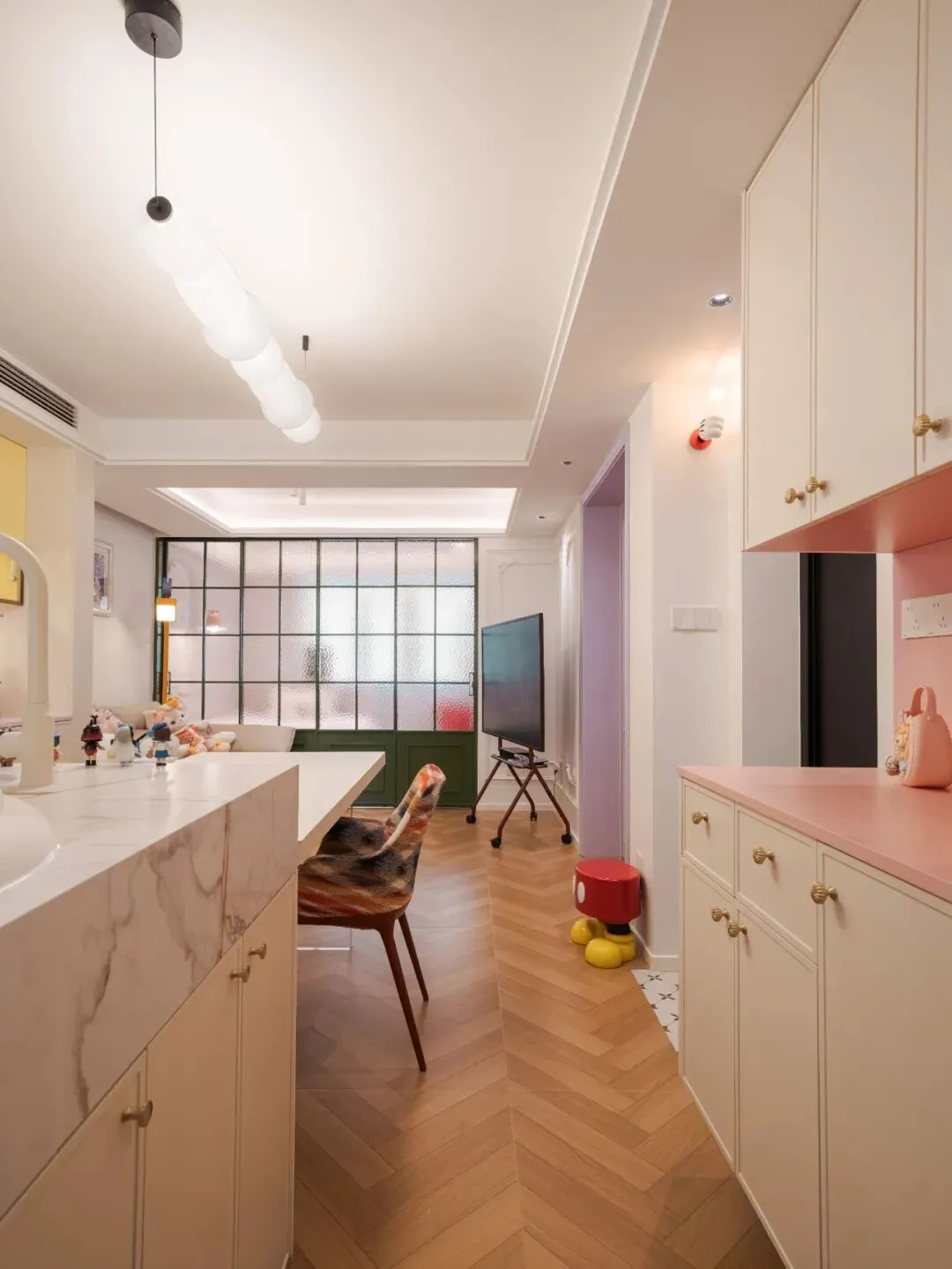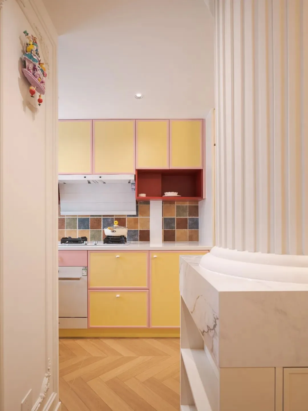 餐厨区打翻了马卡龙色盘,粉、黄、紫在空间里捉迷藏。
