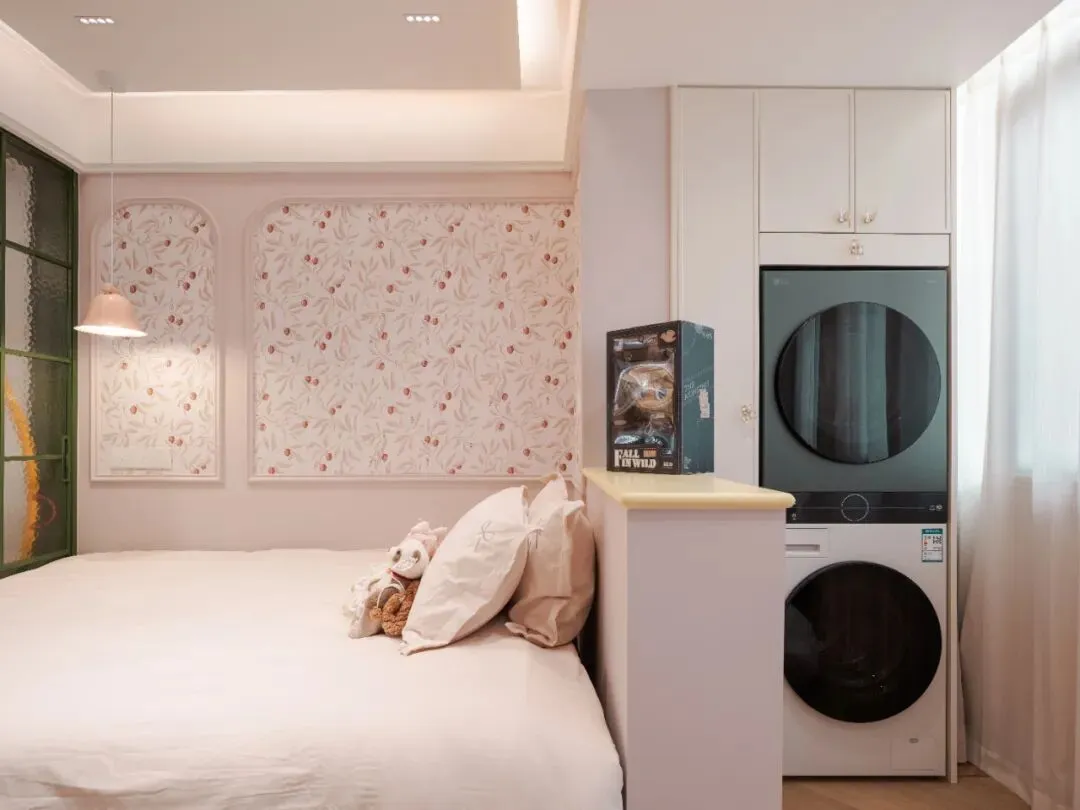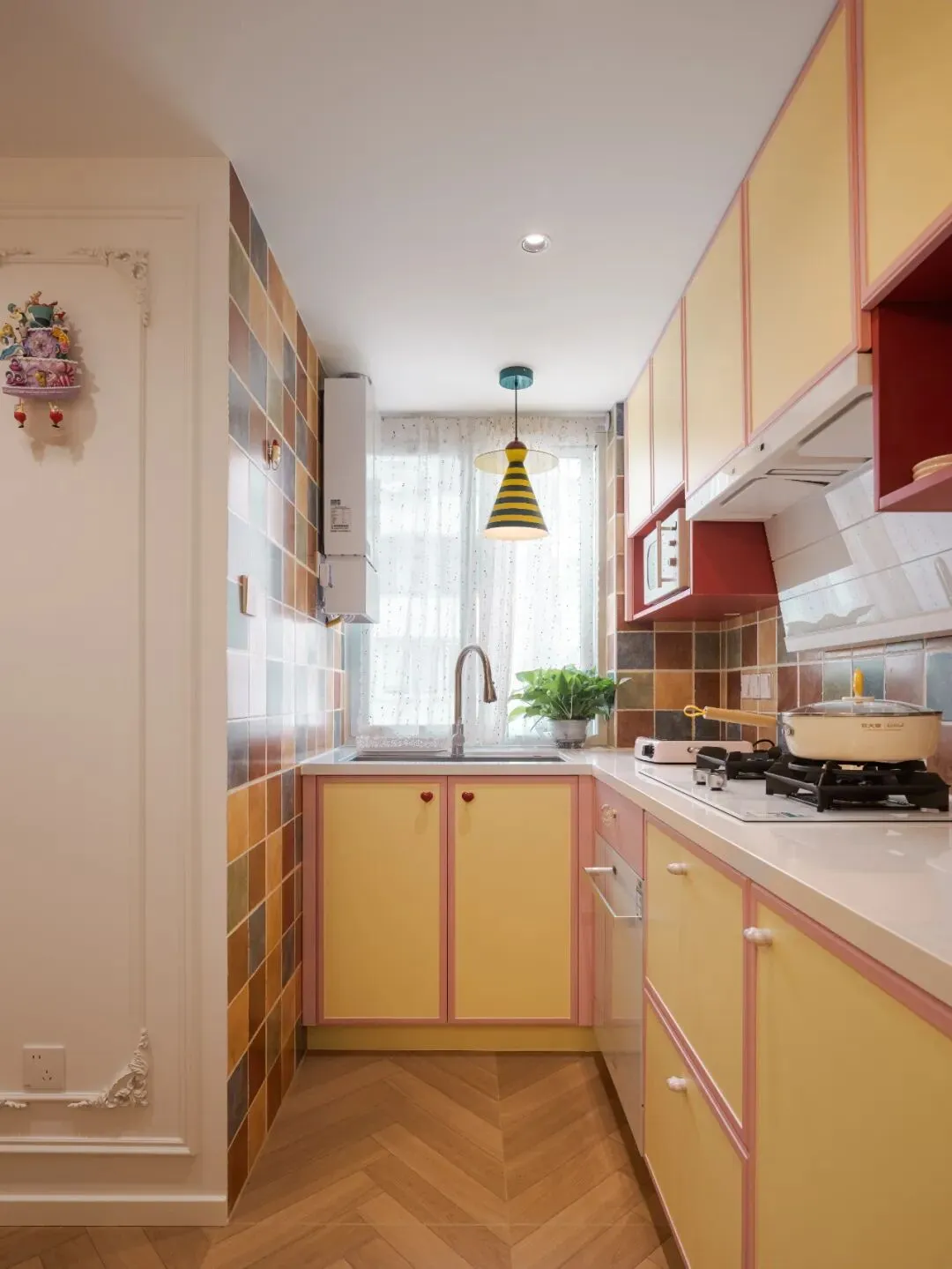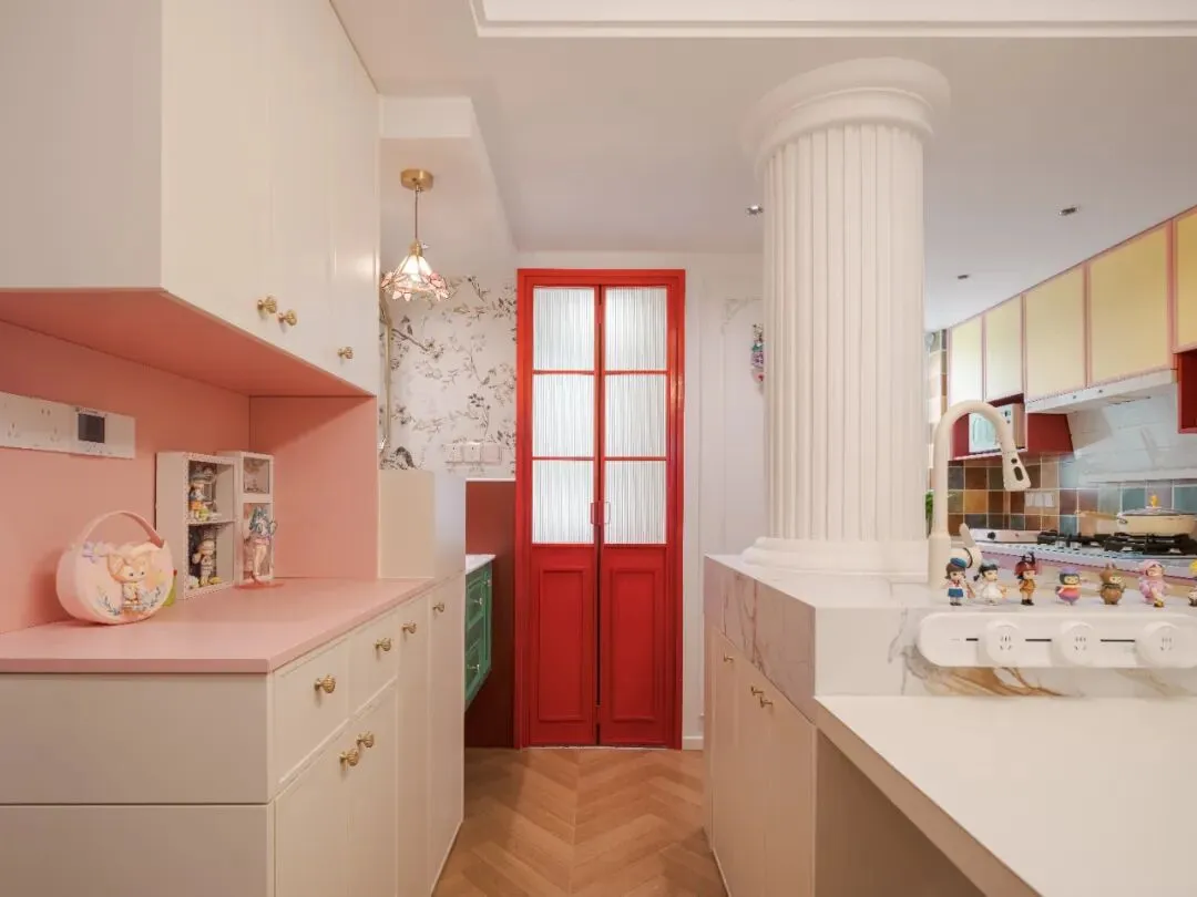 餐厨区打翻了马卡龙色盘,粉、黄、紫在空间里捉迷藏。