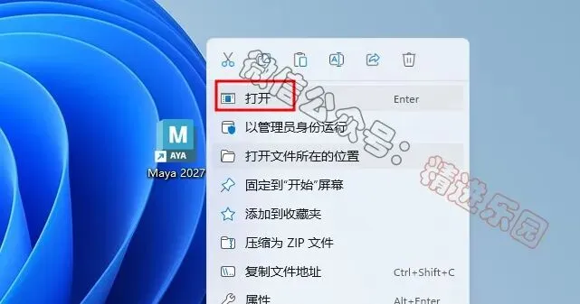 14、回到桌面,右键桌面上的【Maya 2027软件图标】,点击【打开】