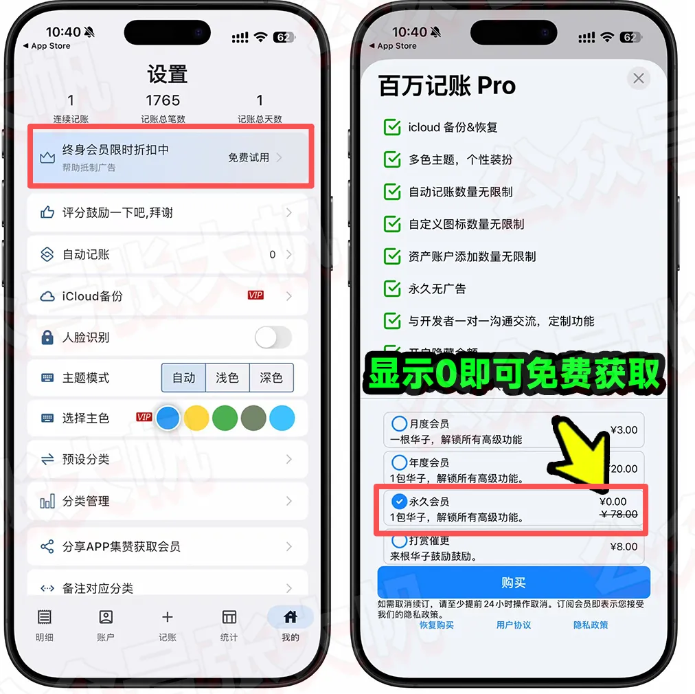 iOS国区也能用!解锁全部高级功能大家好,分享一个还不错的记账APP,目前可以免费获取它的终身会员限时免费中,打开软件从设置进入内购,永久会员显示0.00即可免费获取。
