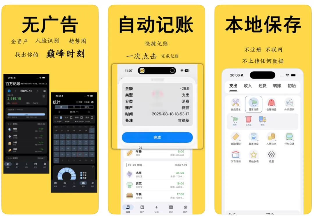 - 自动记账 + 快捷记账,支持微信 / 支付宝 / 银行账单识别