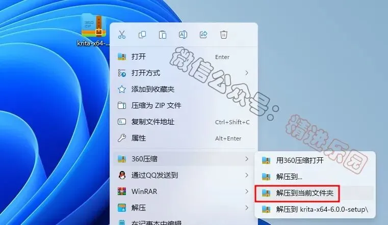 1、下载Krita 6.0软件安装包到电脑上,右键选择【解压到当前文件夹】