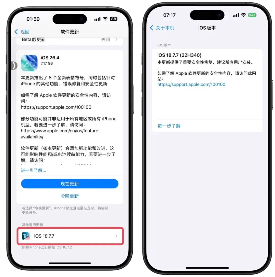 今天凌晨苹果针对 iOS 18 系统发布了iOS 18.7.7 正式版系统更新,版本号为 22H340 提供了重要的安全性更新,苹果建议所有用户安装。