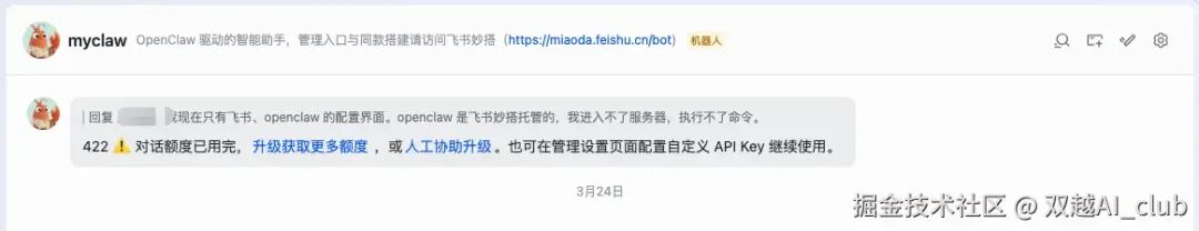 我试用过「飞书妙搭」的 OpenClaw,一键安装,说是免费 30 天,第一天还行,第二天开始就严重限流,引导付费。