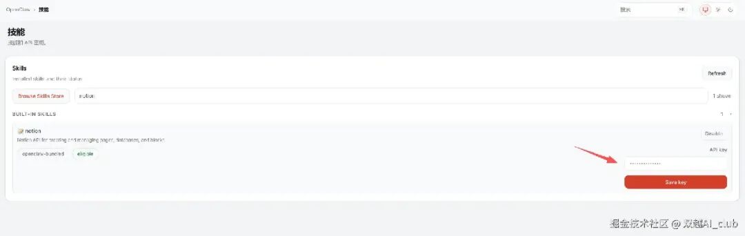 有些 Skill 需要配置 API Key 以获取权限,如 Notion Skill。
