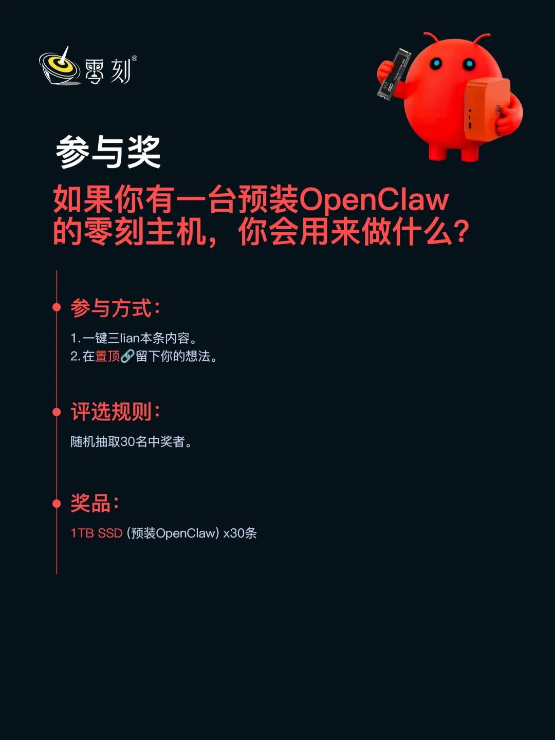 零刻OpenClaw|留下你的想法,得SSD升级包如果你有一台预装OpenClaw的零刻主机,你会用来做什么?欢迎点击『下方🔗』畅所欲言,聊聊你眼中“零刻+OpenClaw”的无限可能。🔗零刻+OpenClaw安装及应用分享活动🎁 随机抽30位参与者,每人1块 1TB SSD(已预装OpenClaw)⏰ 活动截止至4月25日