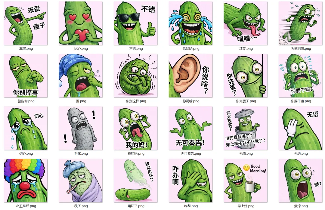 邪恶黄瓜,这表情你看了之后肯定会下载!说实话,这个表情我做了这么多套还是比较喜欢的一款表情了,不管是邪恶的程度还是夸张的姿势,我都觉得还挺到位的。蔬菜系列开始准备做拉,大家还有什么喜欢的蔬菜吗?可以在评论区留言,我每条信息都会看,并且也会做出来。怎么才能让文章曝光呀~完全不懂。只会埋头苦做。上面这篇文章集合了我所有的表情,可以在上面的文章评论区查看噢~