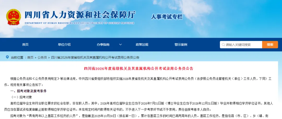 届时,准备参加2027四川省考的考生,可以登录“四川省人力资源和社会保障厅”,找到“人事考试专栏”,即可查看详细公告职位表。