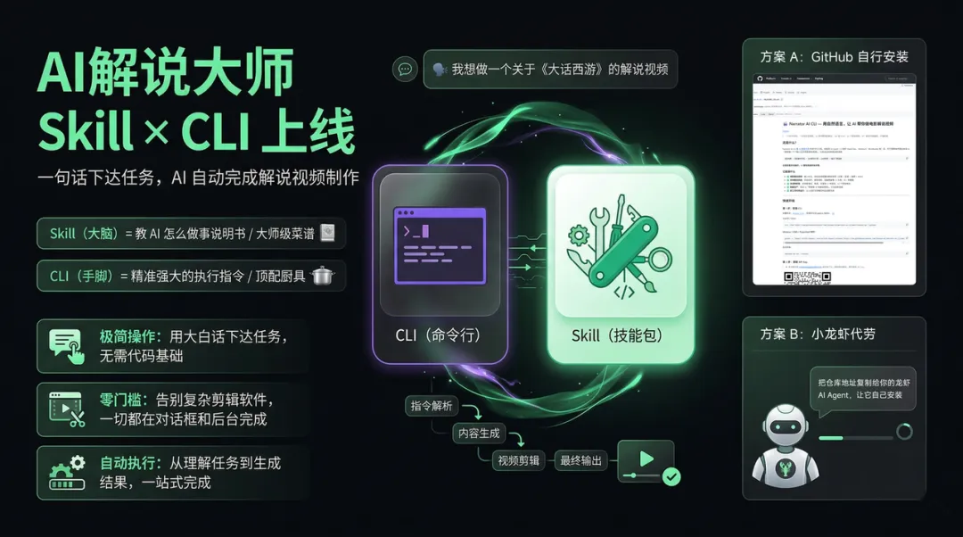 📦 CLI 工具仓库:github.com/jieshuo-ai/narrator-ai-cli 🧠 Skill 技能文件仓库:github.com/jieshuo-ai/narrator-ai-cli-skill