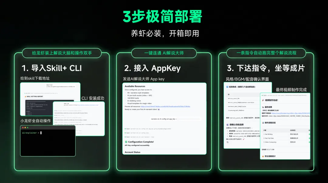# Windows 用户python --version# macOS 用户python3 --versionxcode-select--installgit --versionpython -c"import urllib.request; exec(urllib.request.urlopen('https://raw.githubusercontent.com/jieshuo-ai/narrator-ai-cli/main/install.py').read())"curl -fsSL https://raw.githubusercontent.com/jieshuo-ai/narrator-ai-cli/main/install.py | python3# 第 1 条:用镜像加速下载代码git clone https://ghfast.top/https://github.com/jieshuo-ai/narrator-ai-cli.git# 第 2 条:进入项目目录cd narrator-ai-cli# 第 3 条:安装 CLI(macOS 用 pip3)pip install -e .narrator-ai-cli --versionnarrator-ai-cli config set app_key 你的API_Keynarrator-ai-cli user balancemkdir -p ~/.openclaw/skills/narrator-ai-cli# 先把 SKILL.md 下载到本地,然后复制进去cp SKILL.md ~/.openclaw/skills/narrator-ai-cli/SKILL.md请帮我安装这个 CLI 命令行工具:https://github.com/jieshuo-ai/narrator-ai-cli请学习这个技能文件:https://github.com/jieshuo-ai/narrator-ai-cli-skill/blob/main/SKILL.md帮我做一个飞驰人生的电影解说视频