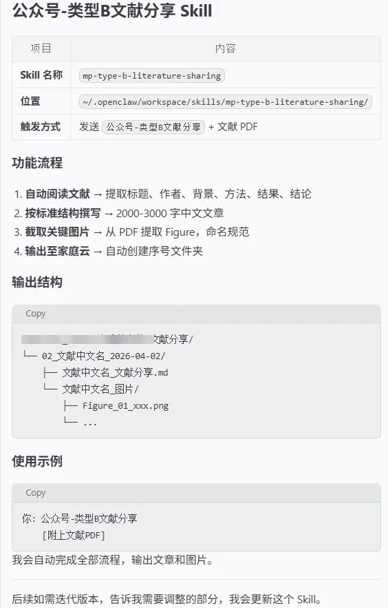 以下文本内容都为openclaw阅读后生成,图片也是他自行截取和匹配的,最终截取和生成的东西可以让它在你指定的目录下创建文件夹并依次写入,基本就是可以直接用,数据排版都没有问题。另外,它的这个操作过程可以生成一个skill,当然你也可以直接用别人分享出来的skill。这个目前还只是最最最初级的使用体验,用的文章也是之前发过的一篇文章,主要是为了对比一下ai撰写和我撰写的差异,后期可以持续完善skill,让他最终可以自动完成文献分享的工作,以下为skill-V1.0: