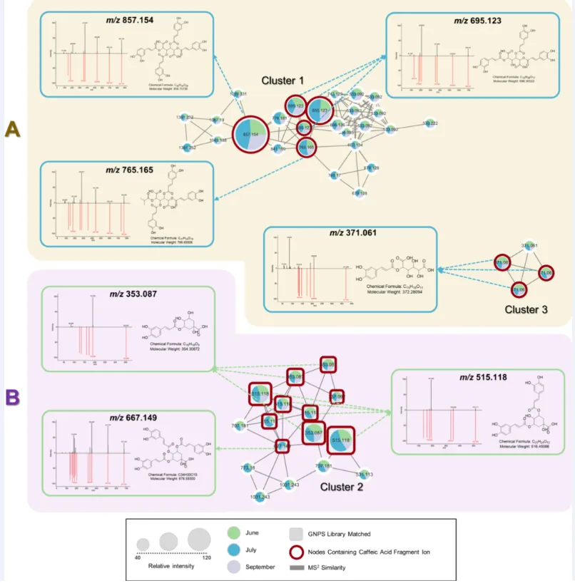 图示内容:通过分子网络分析鉴定IJE中的咖啡酰葡萄糖酸和咖啡酰奎宁酸类化合物。Cluster 1和3为咖啡酰葡萄糖酸衍生物,Cluster 2为咖啡酰奎宁酸衍生物。红色边框节点表示含有咖啡酰基团的化合物。