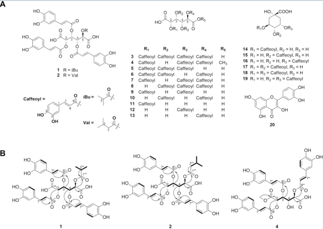 3个新咖啡酰葡萄糖酸:inulajaponic acids A-C(化合物1、2、4)