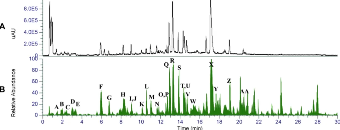 图示内容:(A) IJE的UHPLC-PDA色谱图;(B) 负离子模式下的基峰色谱图(Base Peak Chromatogram),标注了各峰的鉴定结果(A-Z, AA)。