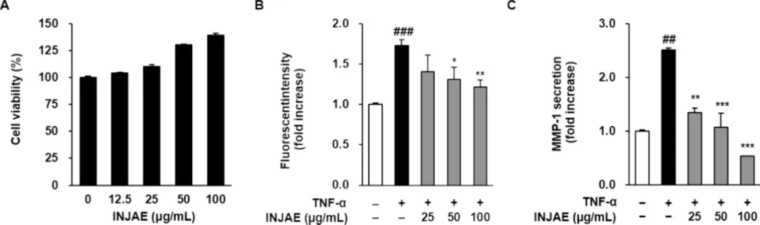 图示内容:从IJE分离的各化合物(25、50、100 μM)对TNF-α诱导的NHDF细胞中MMP-1分泌的影响。MMP-1分泌量通过ELISA试剂盒测定。