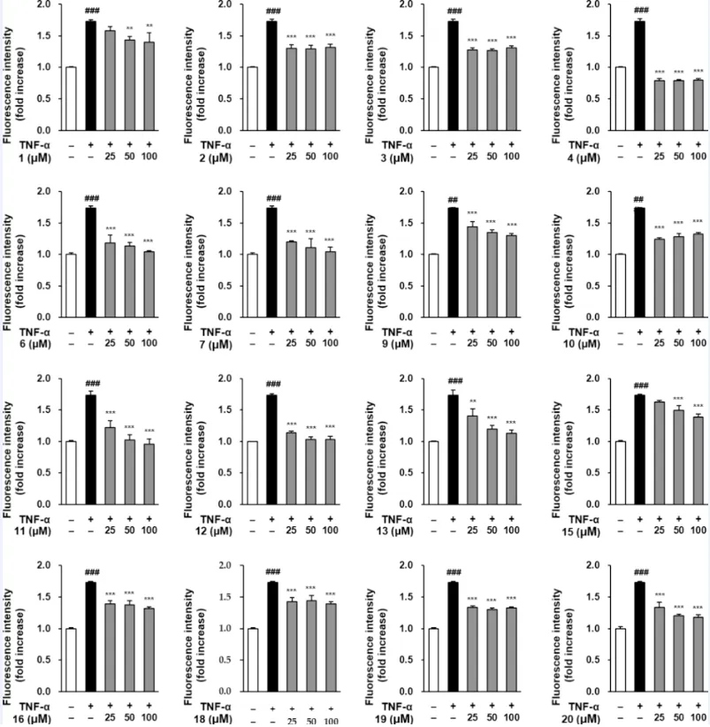图示内容:从IJE分离的各化合物(25、50、100 μM)对TNF-α诱导的NHDF细胞中ROS产生的影响。ROS水平通过DCFDA荧光法测定。
