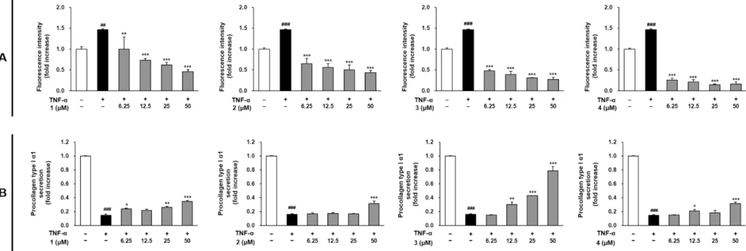 Figure 7 | Figure_07_ROS_procollagen.png | 化合物1-4对ROS和I型前胶原蛋白的影响 |