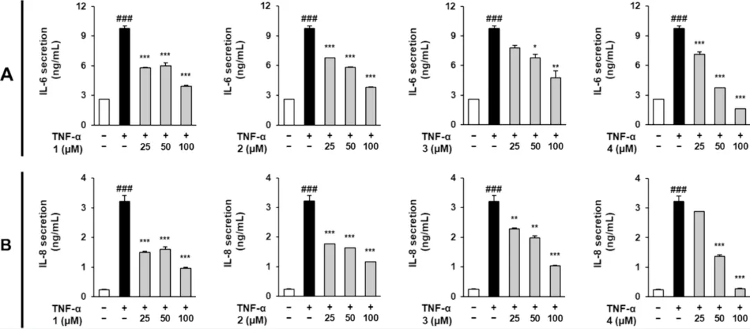 图示内容:化合物1-4对TNF-α诱导的NHDF细胞中炎症因子分泌的影响:(A) IL-6分泌水平;(B) IL-8分泌水平。