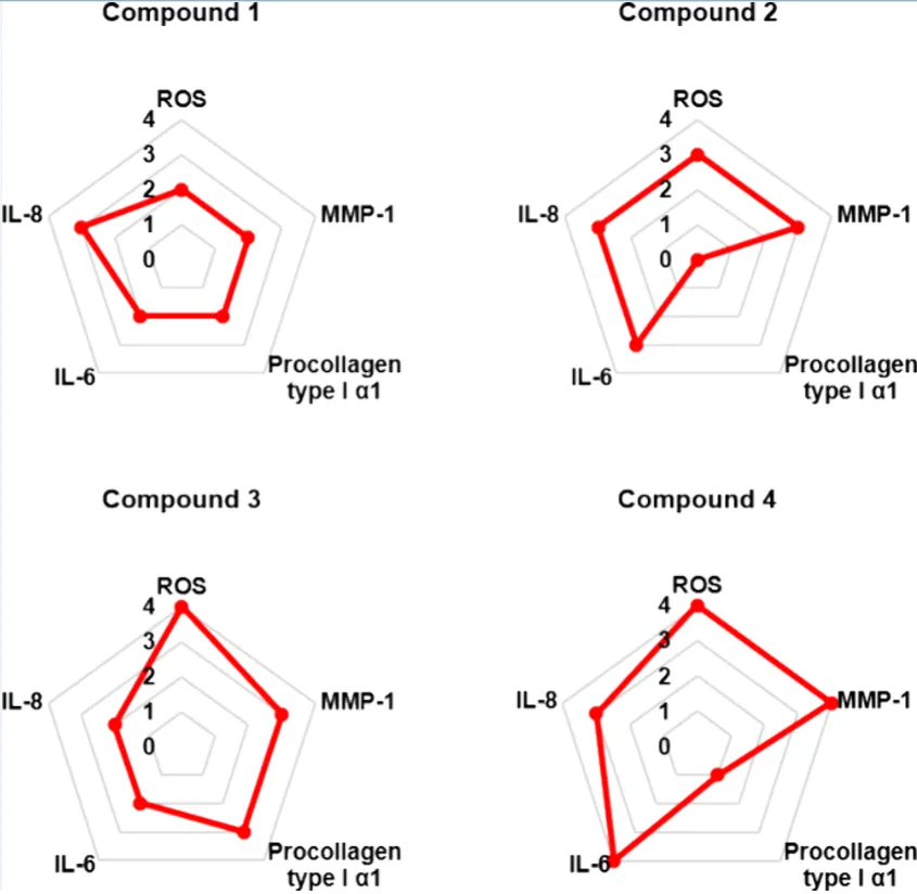 图示内容:化合物1-4在五个皮肤老化相关指标上的综合效果雷达图分析。五个指标包括:ROS抑制、MMP-1抑制、I型前胶原蛋白恢复、IL-6抑制、IL-8抑制。