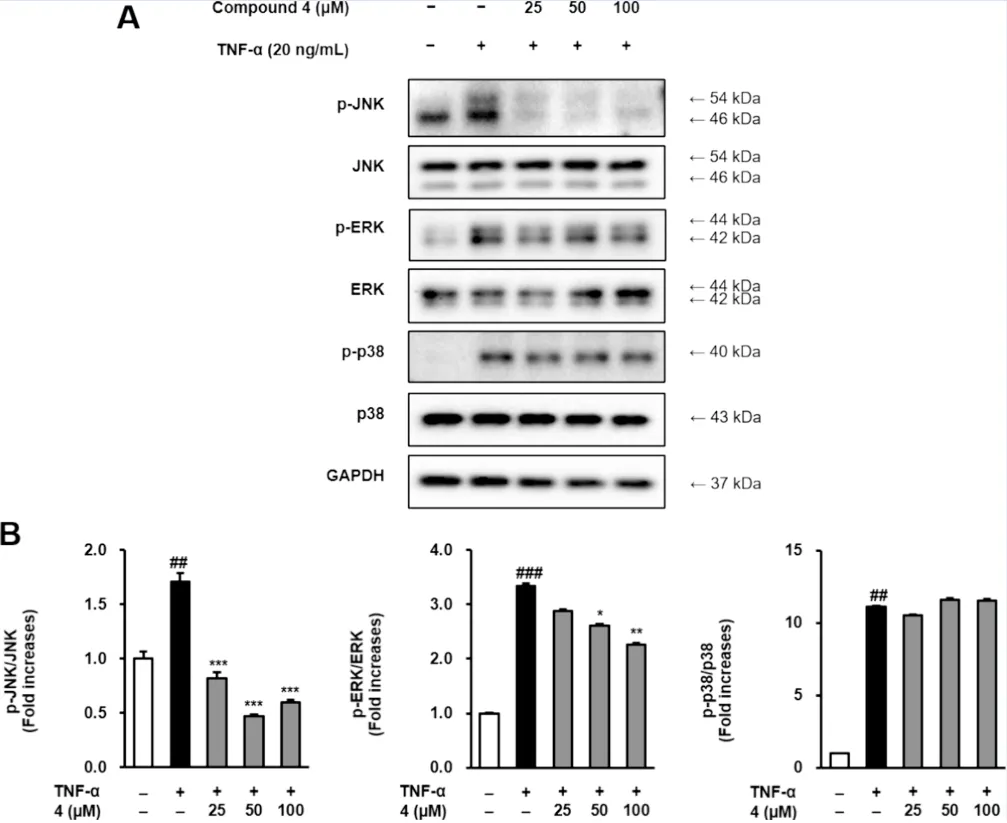 图示内容:Inulajaponic acid C(4)对TNF-α诱导的NHDF细胞中JNK、ERK和p38蛋白磷酸化水平的影响。细胞用25、50、100 μM化合物4处理1小时后,再用20 ng/mL TNF-α处理15分钟。