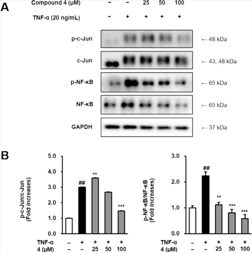 图示内容:Inulajaponic acid C(4)对TNF-α诱导的NHDF细胞中NF-κB和c-Jun蛋白磷酸化水平的影响。