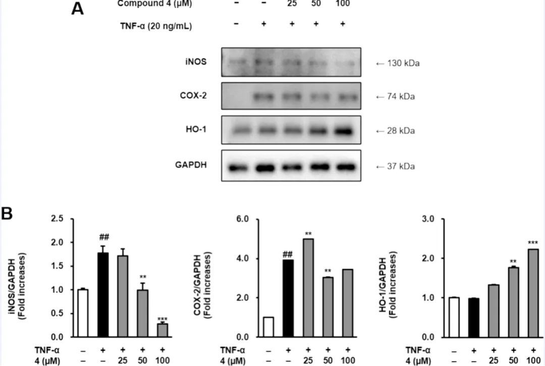 图示内容:Inulajaponic acid C(4)对TNF-α诱导的NHDF细胞中iNOS、COX-2和HO-1蛋白表达水平的影响。