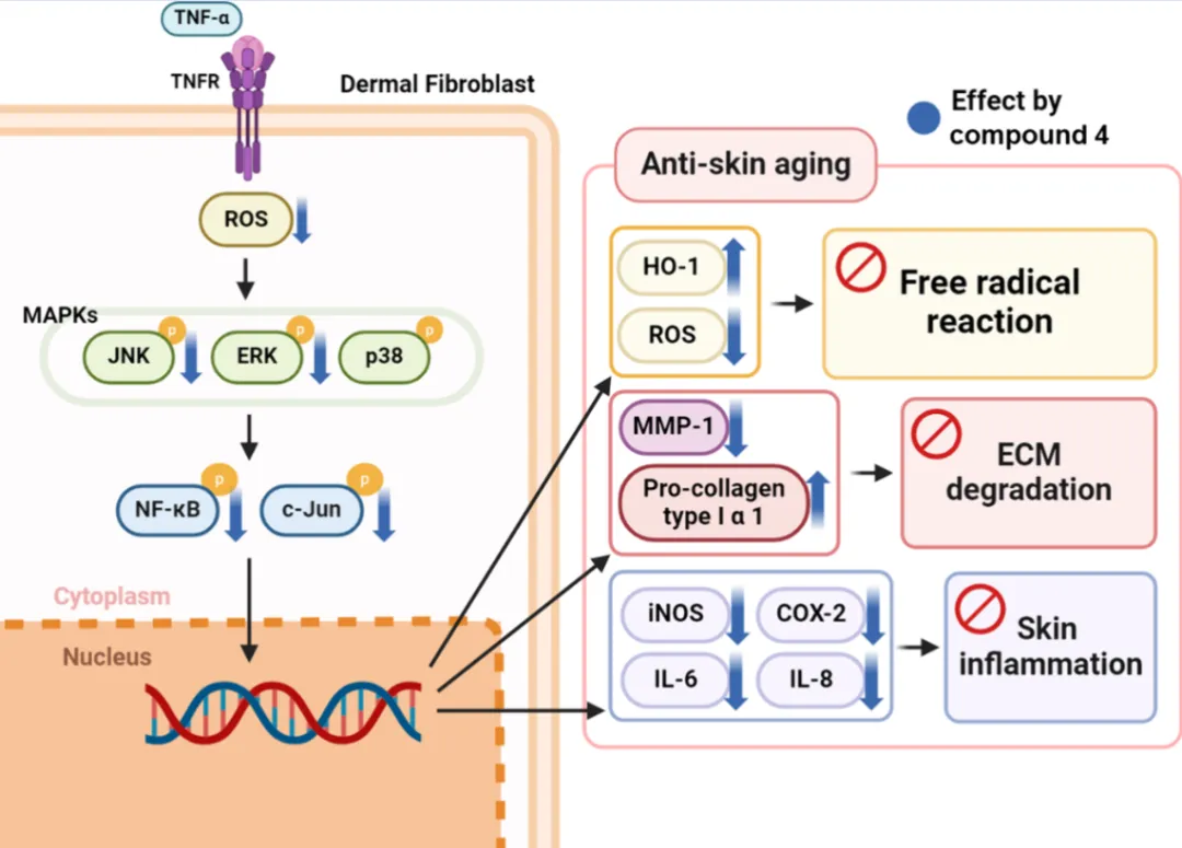 机制研究表明,化合物4通过抑制ERK、JNK、NF-κB和c-Jun的磷酸化,通过MAPK-NF-κB/AP-1信号通路调节炎症细胞因子和其他皮肤老化过程。此外,化合物4下调iNOS和COX-2表达,上调HO-1表达,表明其具有缓解与皮肤老化相关炎症的潜力。